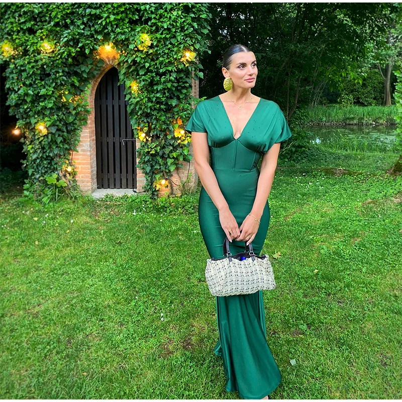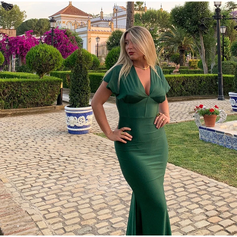 Women Sexy Fashion V-neck Slim Maxi Dress Elegant Solid Short Sleeved Bodycon Dresses 2024 New Female Banquet Party Gowns